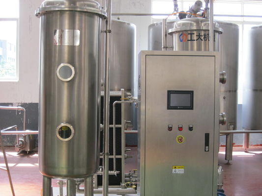 Sekcja wylotowa pompy karbonatowej: dobry stosunek syropu zmieszanego z wodą przez pompę węglową, poprzez zawory ilościowe, przepływomierze, zawory zwrotne, mieszalniki statyczne do zbiorników magazynowych. Mieszalnik statyczny wypełniony wieloma płytami falistymi, zwiększający powierzchnię kontaktu gaz-ciecz i czas kontaktu, wstępne nasycanie napojów importowanych do mieszalnika statycznego w tym samym czasie, dostęp do 0,6Mpa gazu CO2, płynne połączenie obrotowe przez labirynt falistych folii , po raz kolejny zmieszane, więc pić, aby osiągnąć wymaganą zawartość powietrza. Następnie wejdź do zbiornika utrzymując ciśnienie, CO2 całkowicie rozpuszcza się w napoju.